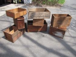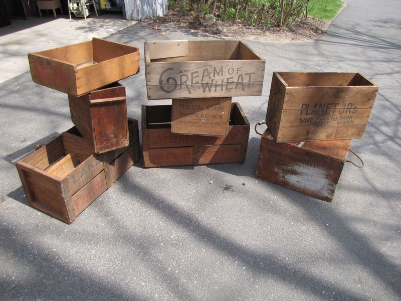 8 vintage advertising wooden crates including Lake Fruit company, Pacific Fruit Exchange, Reliable Flour, Cream of Wheat, Pedestal Brand Peaches, Sealed Sweet Citrus, Planet JR's, Royal Typewriter Co.