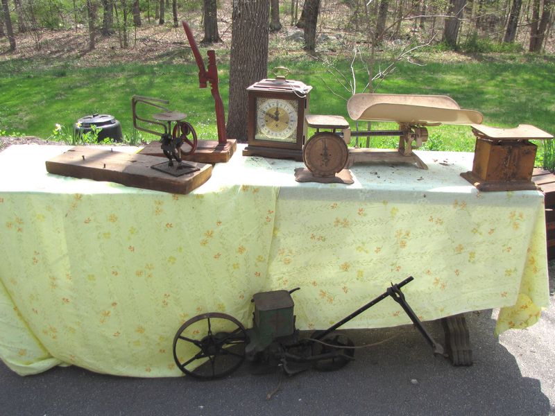 Vintage items including scales, American scroll saw, bottle capper, Planet JR #25 seeder, Howard Miller Carriage Clock with key (func. unk.). Scales include a Detecto baby scale, a Detecto household scale dated 1917, broken, a Pelouze family scale, rusty but working.