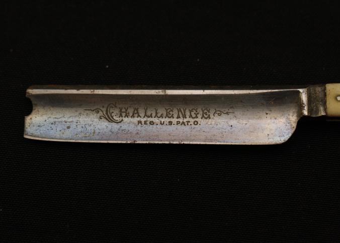 Straight razor. Nude celluloid handle pattern #41. Challenge etched on blade for Challenge Razor Co. Ivory tang covering has piece missing pile side.