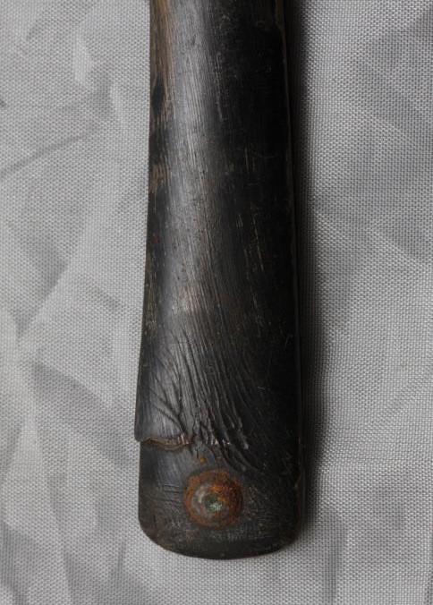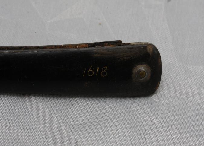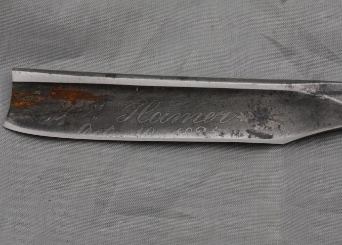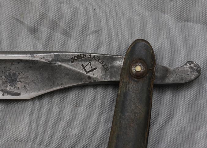 Straight razor. John Barber C-1825 from Lummus Collection with inventory number 1618. Note iron pin covers. Very rare having personalized etched blade of owners name and date "Oct 10 1825." Note split in horn handle. Hand is still secure and tight.