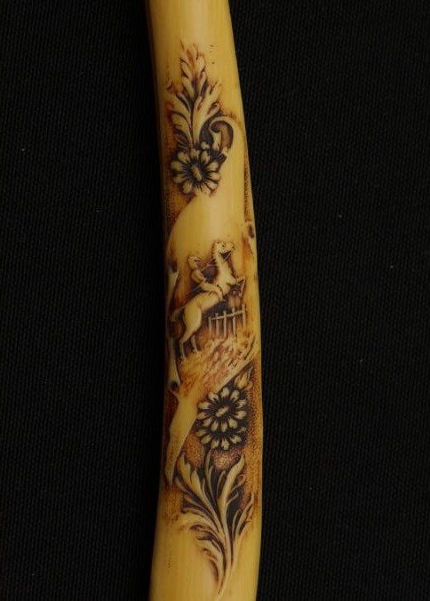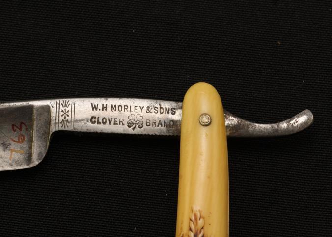 Straight razor. W.H. Moreley & Sons Clover Brand. Rare celluloid handle pattern of horse and rider jumping a fence with floral pattern #29. Blade etched. Note hairline crack.