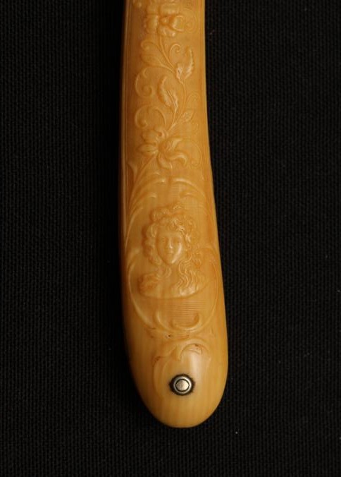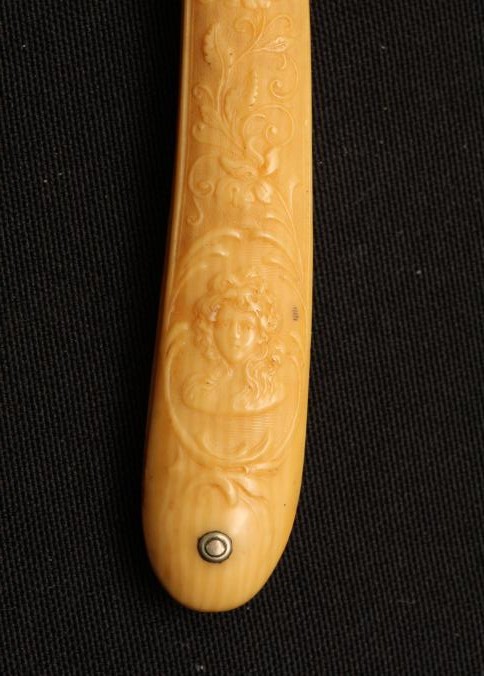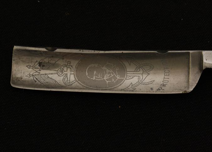 Straight razor. Antoni Tadross. Blade etched with a portrait of Admiral Dewey and word "Protection" with anchor and flags. Note fancy steel work on top of blade. Handle is pattern #77 with woman's head, floral pattern on both sides. Very rare to have both a fancy etched blade and ornate handle on the same razor. Usually, you got one but not the other.