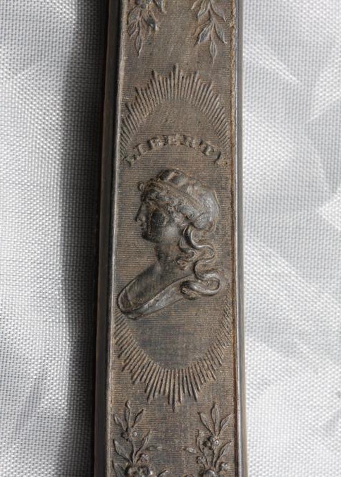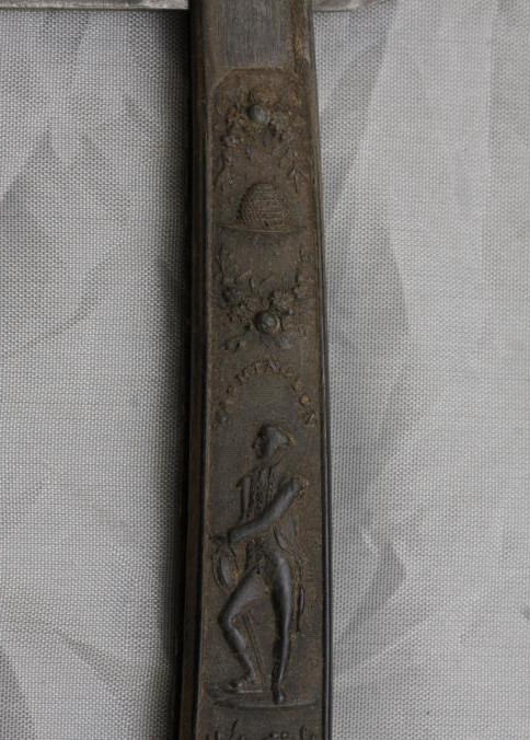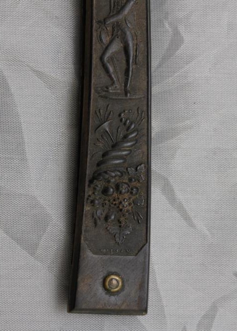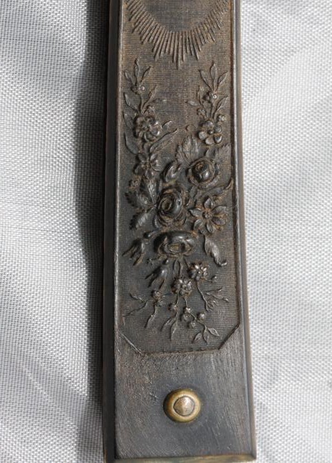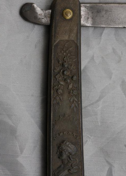 Straight razor. C-1815 "Washington" pressed horn handled with Lady "Liberty" bee hive, cornucopia, floral pattern and wedge blade etched "Magnum Bonum." This is a rare pattern in wonderful condition made by the foremost pressed handle maker "Wilson."