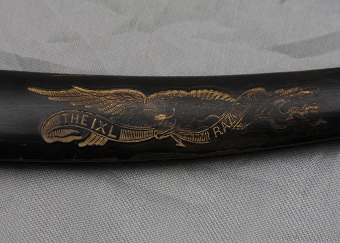 Straight razor. Patriotic motif of gold embossed spread American Eagle on handle and wonderfully etched blade on this C-1850's I*XL razor.