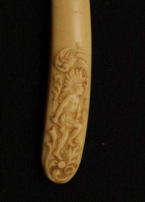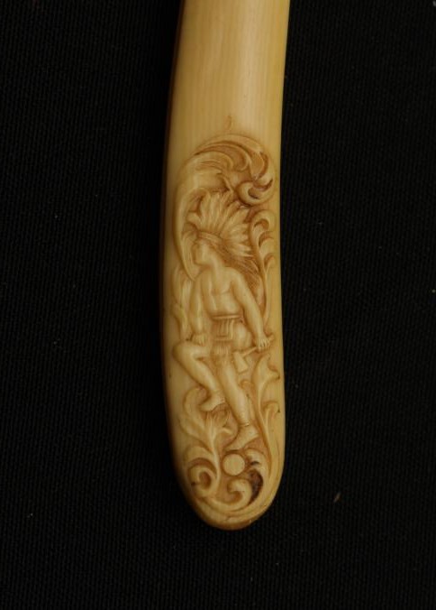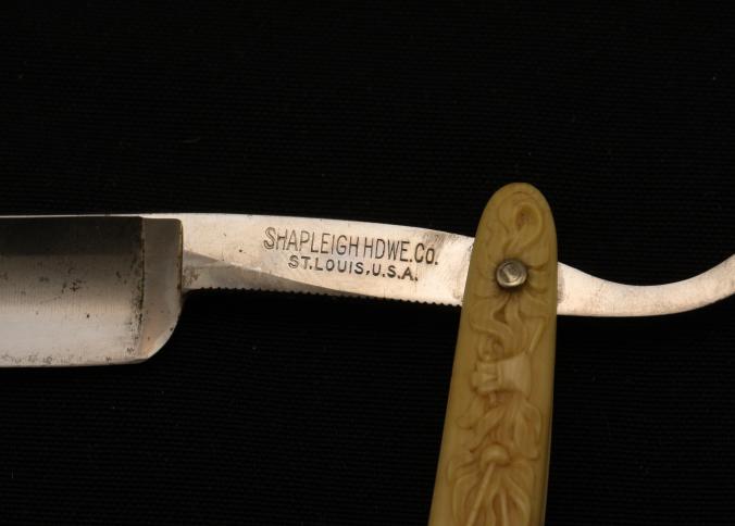 Straight razor. Shapleigh HDWE. Co. St. Louis, USA. A rare American maker with a wonderful imitation ivory, celluloid handle with raised Indian motif with weapons shown in my book as pattern #28. Pattern is on both sides. RARE.