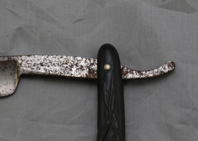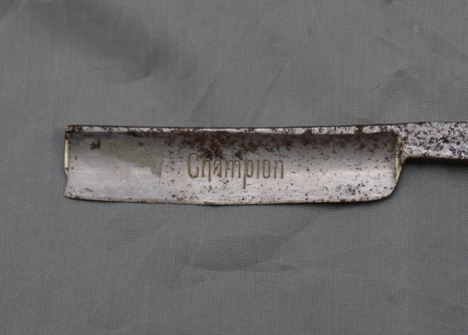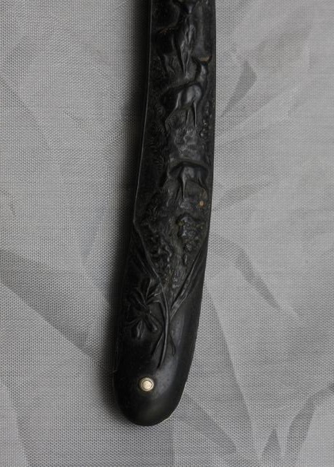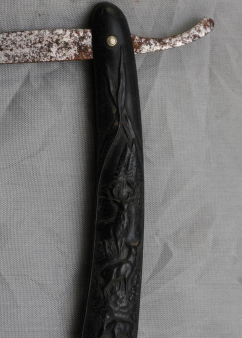 Straight razor. "Champion" etched on blade. Figural black celluloid handle pattern #49 has a raised scene with deer. Very rare in black.
