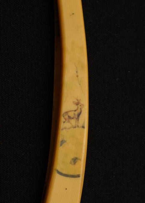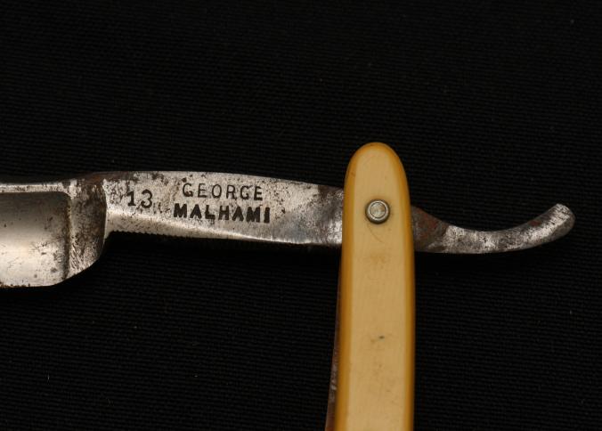 Straight razor. George Malhami. A celluloid handle pattern that I do not have in the handle pattern book of a standing deer but similar to #84 & 85. Shavers name inscribed on pile side of handle.