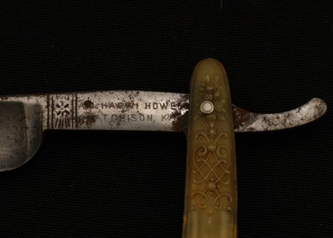 Straight razor. Hardware Co. in KS. Hollow ground blade. Fancy yellowish/green raised Owl pattern #50.