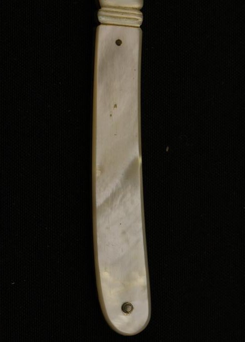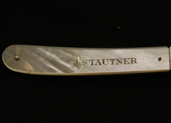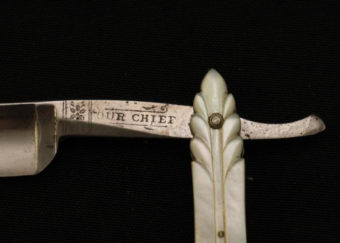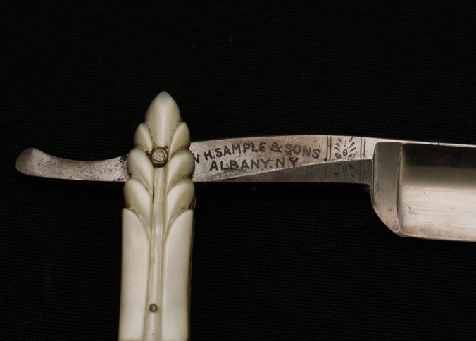 Straight razor. W.H. Sample & Sons Albany, NY "Our Chief" with four section carved mother of pearl handle on shaped metal backing. A rare American maker with personalized name "J. Stautner." Note damage. Handle complete and tight.