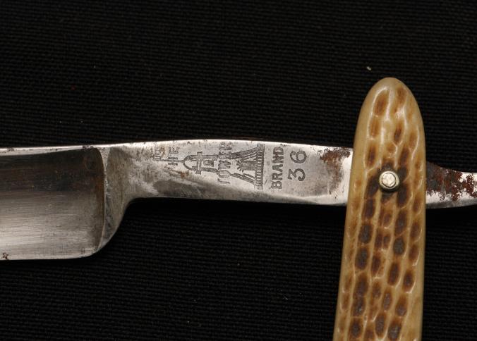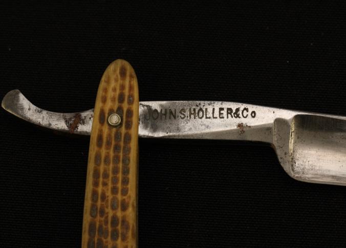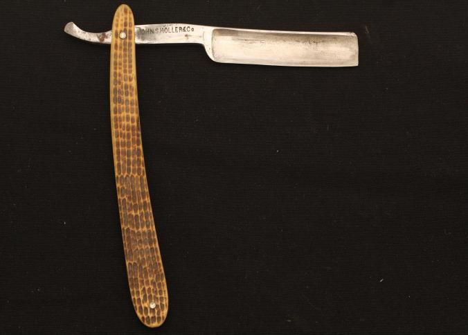 Straight Razor. John S. Holler "Tower Brand" pickbone handle with inlaid escutcheon plate. An elegant piece. Great example of pickbone.