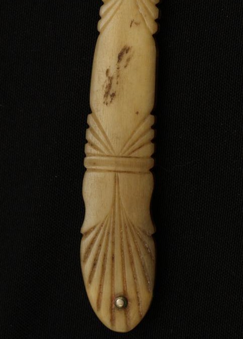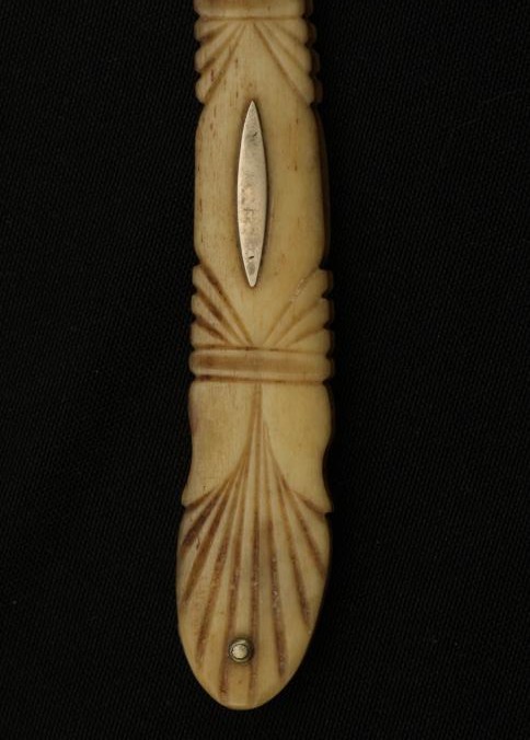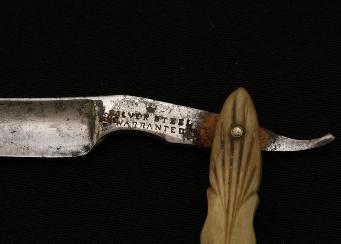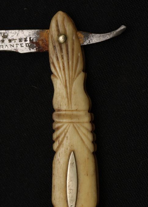 Straight Razor.Silver Steel Warranted C-1840 carved one-piece bone handles having uniquely shaped inlaid escutcheon plate. Rare.