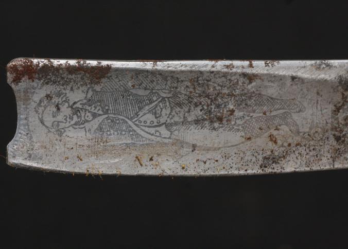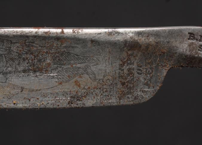 Straight Razor. B.B. Cutlery Sheffield. Fully etched wedge blade with George Washington standing above "Champion of Liberty" with a crude bone handle. Rare maker. C-1860.