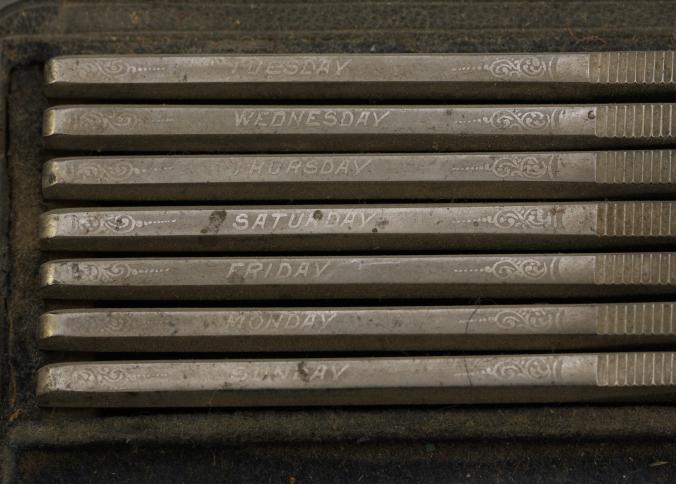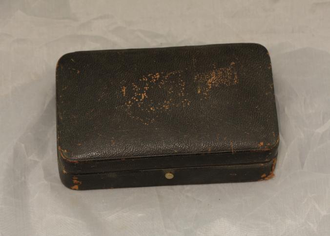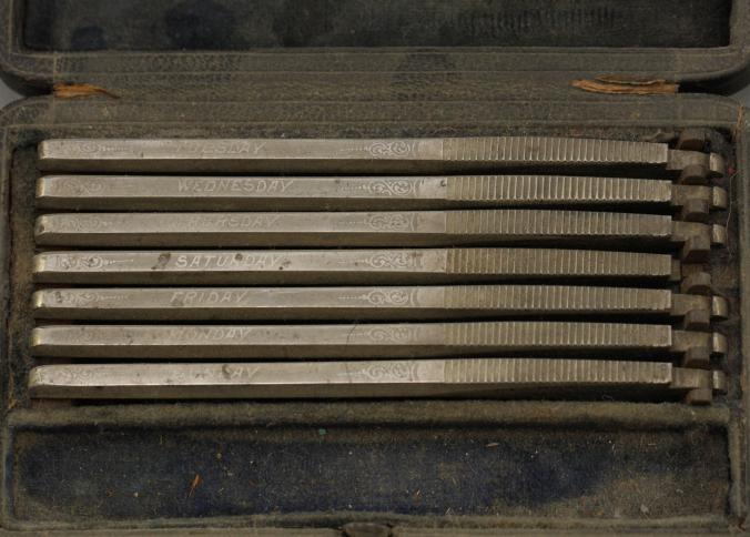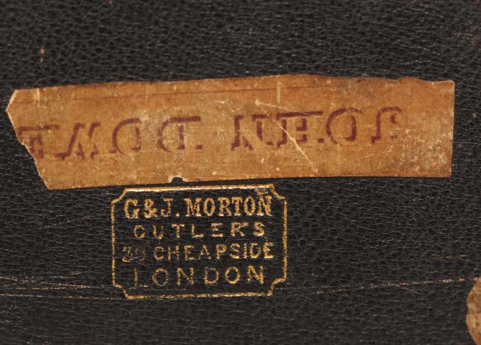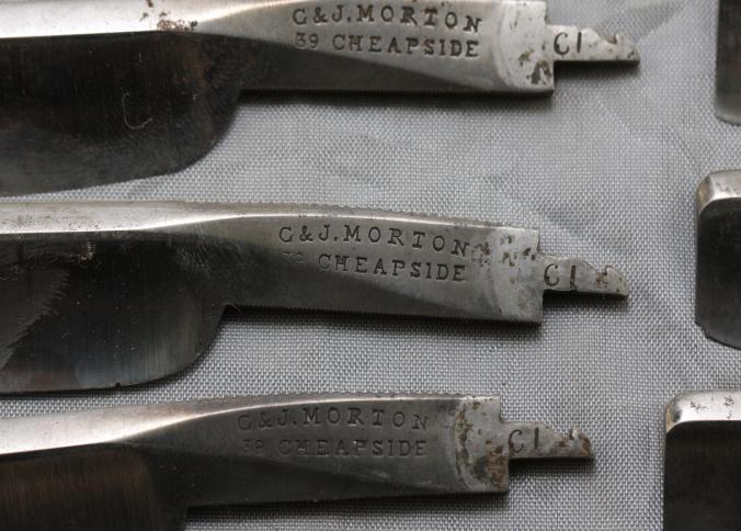 Straight Razor Set. C & J Morton 38 Cheapside (London?) Extremely rare 7-Day set having one ivory handle with locking device and 7 blades each etched with the days of the week on the top fitted in original leather covered wood box. Sadly there is a piece missing from pile side of handle. Still, these early 1820-40 sets are hard to find. Note that the ends of the tangs are stamped with a mark that matches the spring loaded metal locking device. These blades work with this handle only.