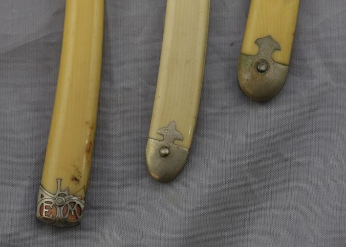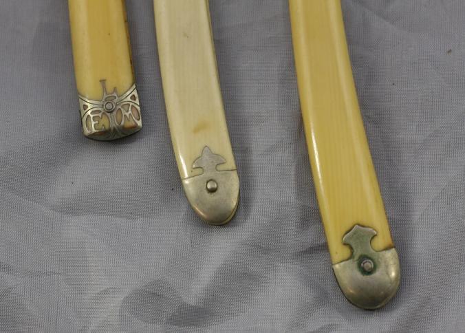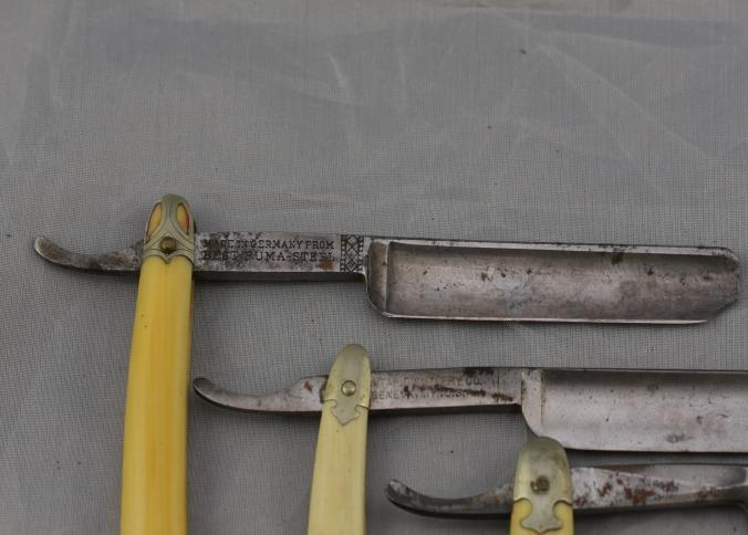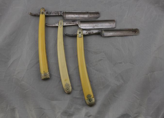 Straight Razors. Three imitation ivory handled razors having fitted German silver end caps. All made in Germany having hollow ground blades.