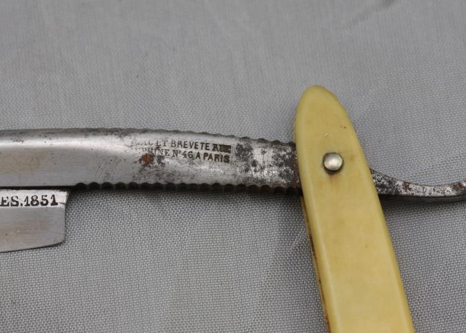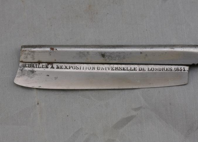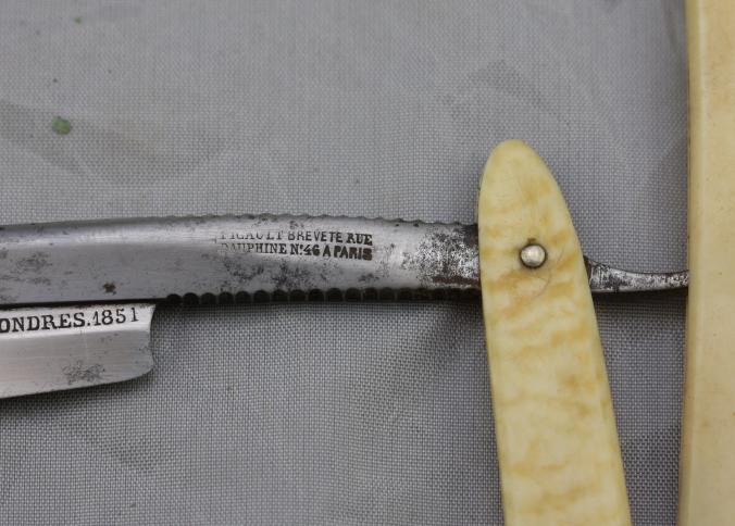 Fabulous Matched Pair of French Ivory Handled Straight Razors dated 1851 in double box. Very uniquely shaped blades with stamping reflecting the "London Exhibition of 1851." What more needs to be said?