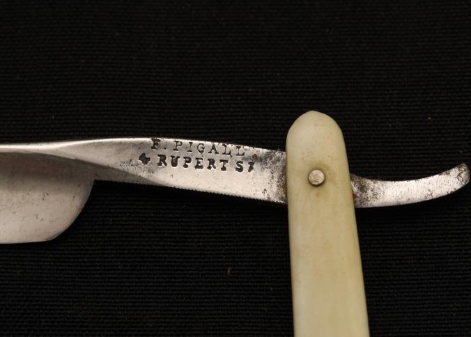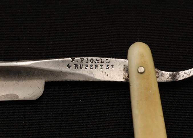Matched Pair of "F. Pigall 4 Rupert St. (London?) ivory handled straight razors numbered "1" and "2" fitted in upright case having detached lid. I have never heard of this maker before. Great pair C-1860-70's.