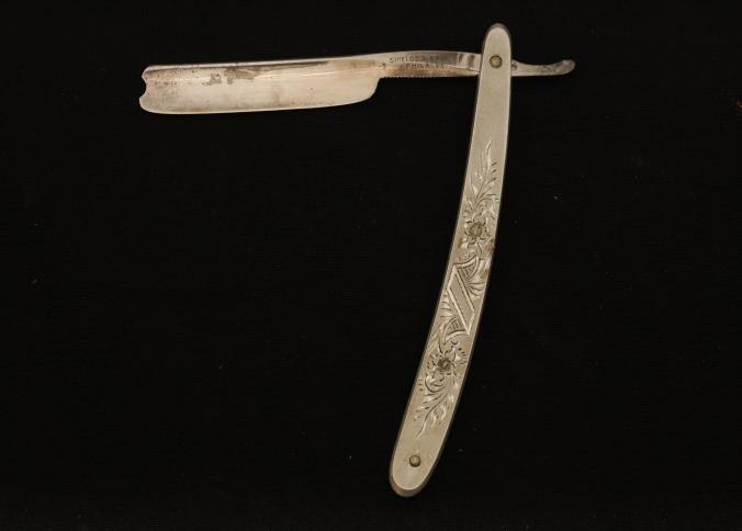 Straight razor. Shield Bros. Philadelphia, PA chased aluminum handle. Rare American maker with a nice handle.