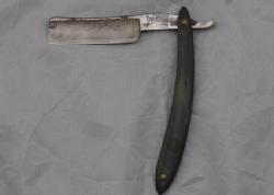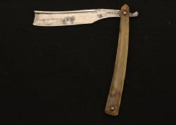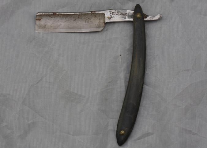 Straight razor. Joseph Elliot For Barbers Use massive razor. Black horn handle with pointed ends. C-1840's.