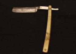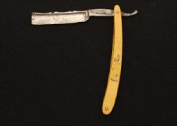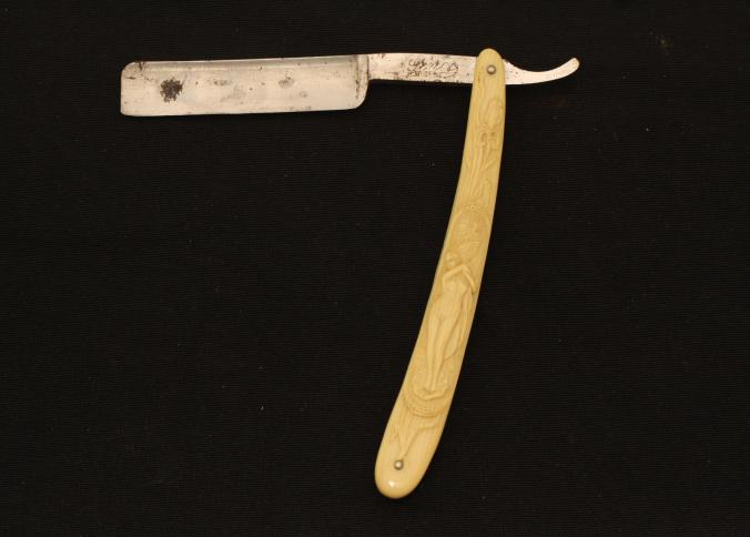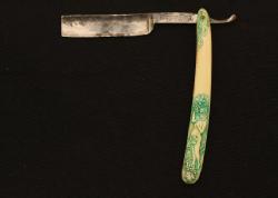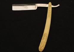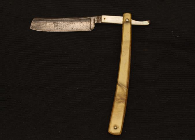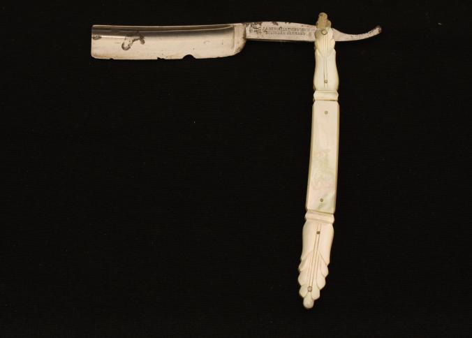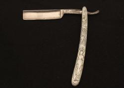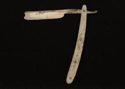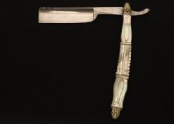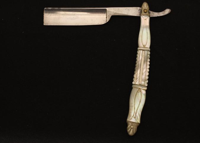 Straight razor. A fabulous silver mounted, carved six panel mother of pearl handle with German silver escutcheon plate. Blade has been cleaned and maybe ground to hollow ground at a later time, or, a replacement. Handle dates to 1820-30. Thankfully, someone saved it. Nonetheless, it is an awesome handle. This razor was illustrated on page 29 of my 1980 book "Straight Razor Collecting."