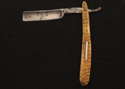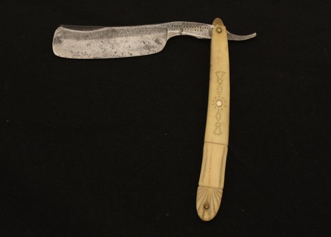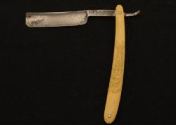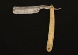 Straight razor. Parkin & Marshall Sheffield. C-1830 carved bone handled straight razor with inlaid pique work around a larger round German silver inlay. Rare maker. Note damage.