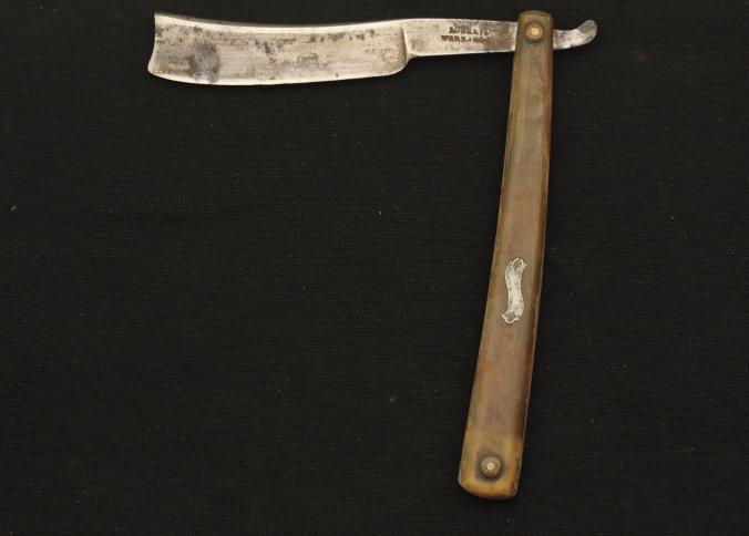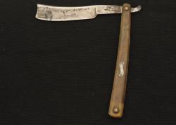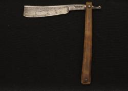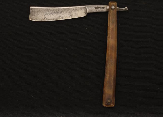 Straight razor. Clark & Hall Warranted C-1810. Mottled horn front side with matching, shaped, replacement wood pile side. Again, some craftsman went through a lot of trouble at the time to save his shaving tool that would last him his lifetime as well that of his son and grandson. The original hardware was used to reassemble. A rarity.