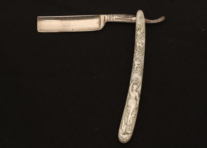 Straight razor. Chas. Adam Rochester, NY fancy aluminum handled razor having raised winged Goddess on winged wheel. "Faultless" on tang and pile side of handle with raised alligator. Lots of scroll. Having two of these in the same auction might make them look more common. But, for those collecting for a while, you know how rare these are. Part of the challenge is that I have been buying fancy and unusual razors since I was 16 and now I just circled the sun for the 64th time!