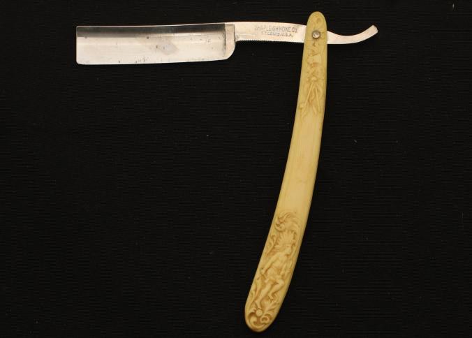 Straight razor. Shapleigh HDWE. Co. St. Louis, USA. A rare American maker with a wonderful imitation ivory, celluloid handle with raised Indian motif with weapons shown in my book as pattern #28. Pattern is on both sides. RARE.