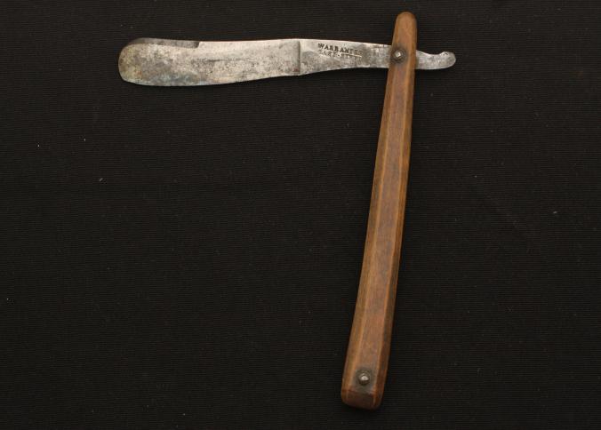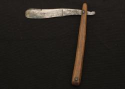 Straight razor. Warranted Cast Steel. 18thC, perhaps 1760+. Unusually shaped blade with rounded point attached to a straight one piece wood handle having beveled perimeter. Iron pins and pin covers. Wood handles are extremely rare. I am not sure if this is an early folk art handmade replacement, or original. My guess is that they have been together for at least 150 year, if not the entire time.