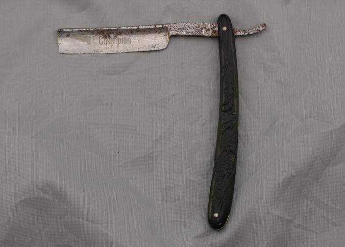 Straight razor. "Champion" etched on blade. Figural black celluloid handle pattern #49 has a raised scene with deer. Very rare in black.