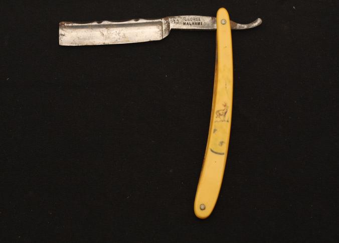 Straight razor. George Malhami. A celluloid handle pattern that I do not have in the handle pattern book of a standing deer but similar to #84 & 85. Shavers name inscribed on pile side of handle.