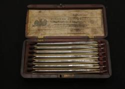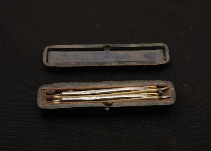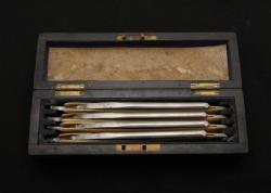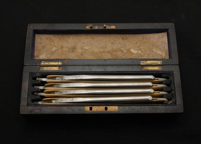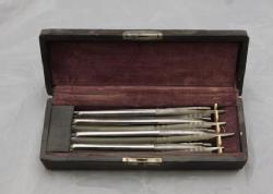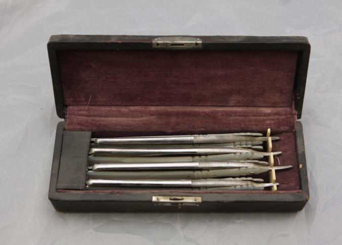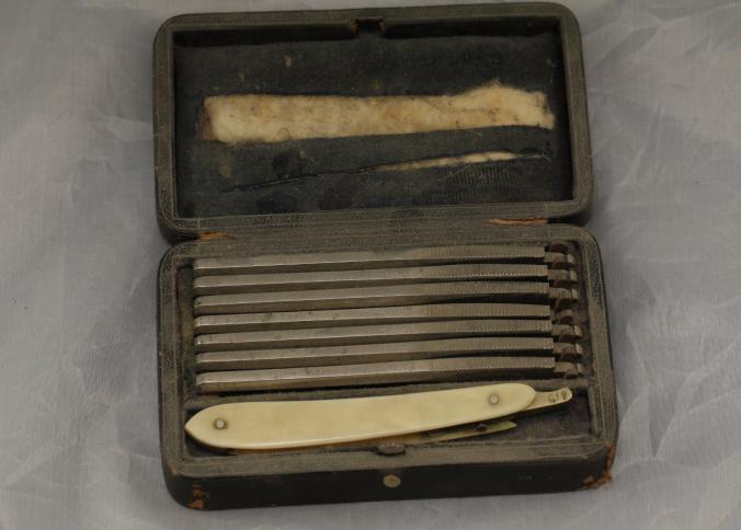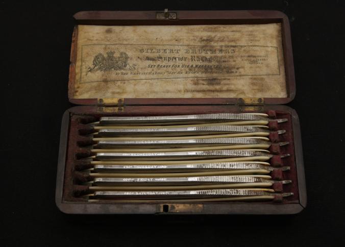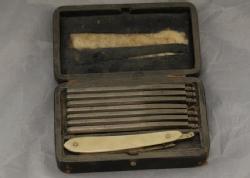 Early Gilbert Brothers cased 7-Day set of ivory handled razors with Days of the Week etched on the tops of the blades. C1830's set it has original box with advertising. Note: small piece of wood missing from end of lid. RARE.