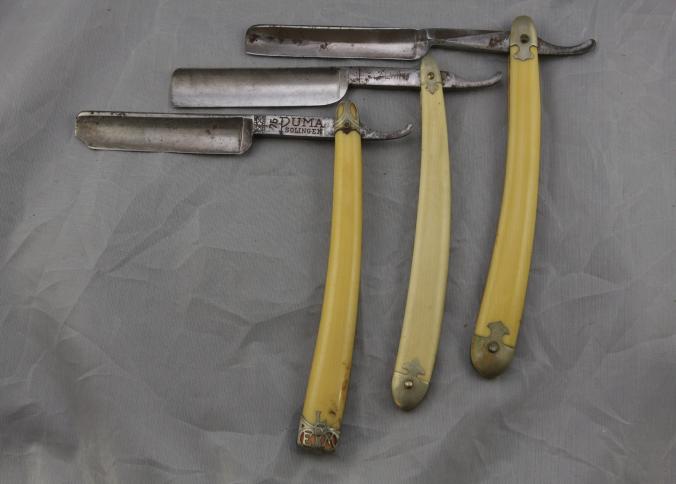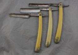 Straight Razors. Three imitation ivory handled razors having fitted German silver end caps. All made in Germany having hollow ground blades.
