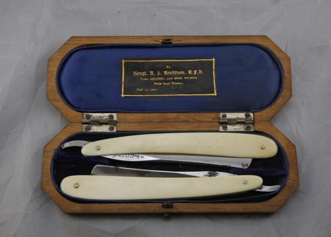 Matched pair of ivory handled Straight Razors fitted in oak octagon shaped presentation case by rare Bowie Knife maker "Wade, Wingfield & Rowbotham." in Sheffield. According to the interior of the felt/satin lined case, these were a gift presented in 1901. The blade are etched on this 114 year old set!