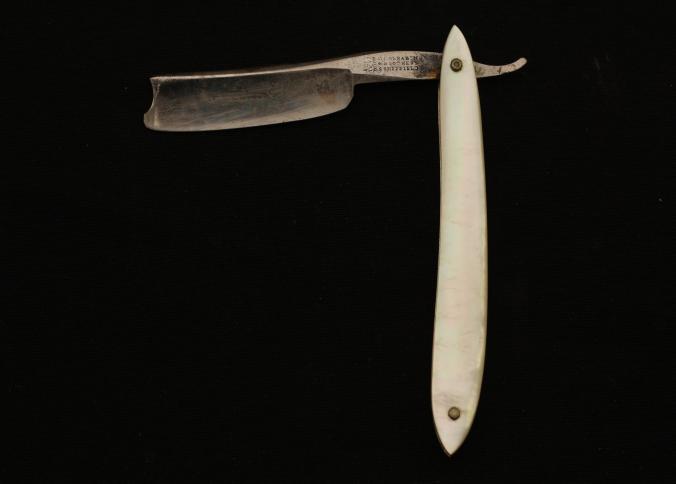 Straight Razor. J. Orrabin Brothers Sheffield. (Rare Maker) one piece mother of pearl handles with pointed ends. One piece pearl is very rare as it is hard to find shell large enough to carve from. C-1850-60.