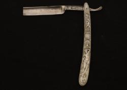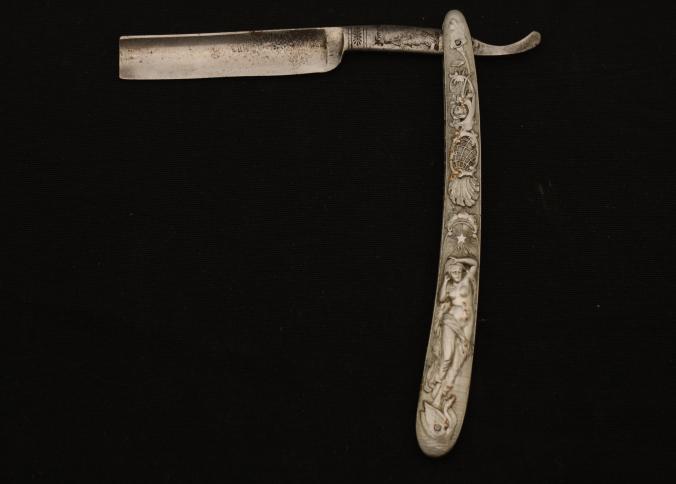 Straight Razor. Buerger Bros. Denver, Col. Made in Germany extremely rare cast figural aluminum handle with "Nymph" motif. Although pile side has a raised alligator and word "Faultless" it appears that the tang pin is a replacement or has been worked on. Great floral pattern both sides. Swans at the feet of the Nymph are a nice touch.