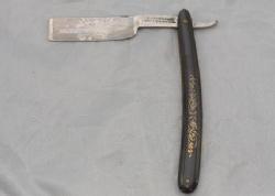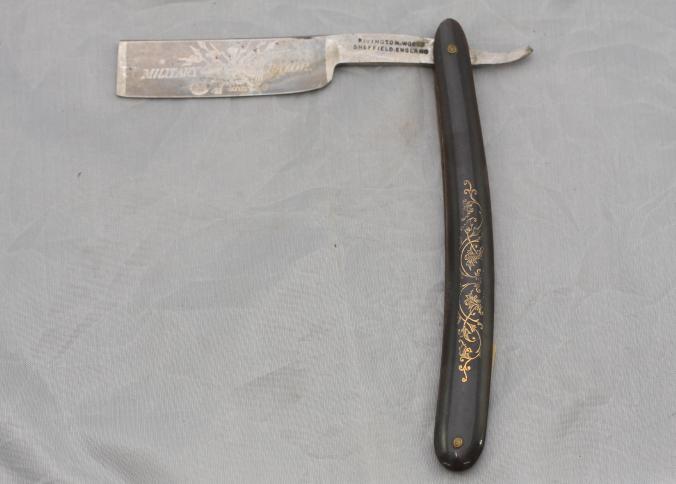 Straight Razor. Rivington Works Sheffield, England "Military Razor" with fantastic, fully etched blade with cannon, flags, muskets, bayonets, etc. Black buffalo horn handle. This etched blade was illustrated on page 64 of my 1980 book "Straight Razor Collecting." Super!
