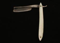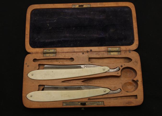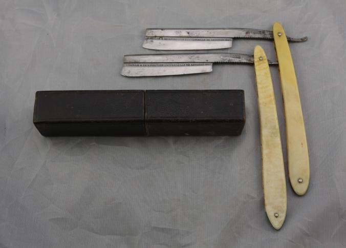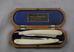 Fabulous Matched Pair of French Ivory Handled Straight Razors dated 1851 in double box. Very uniquely shaped blades with stamping reflecting the "London Exhibition of 1851." What more needs to be said?