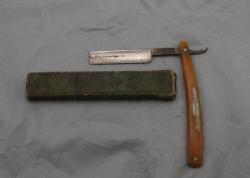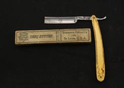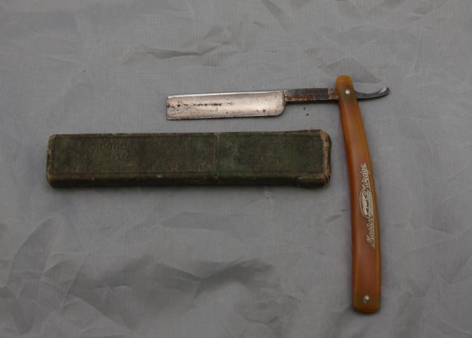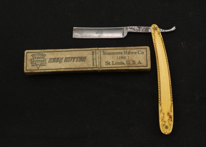 Straight Razor. Boxed Simmons Hdwe. Co. with fancy imitation ivory celluloid handle, pattern #138. Scarce and desirable American distributor with original box.