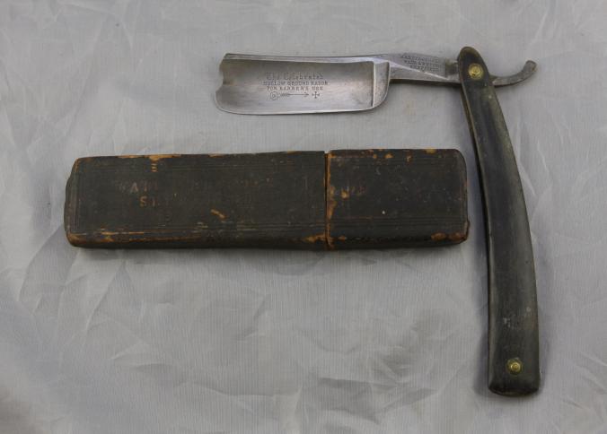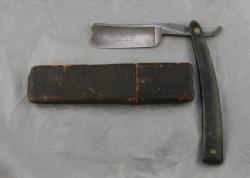Straight Razor. Massive Wade & Butchers "For Barber's Use" black buffalo handled with etched blade and original box. These massive blades were said to be popular with the Irish immigrants of the 1840's-1850's.