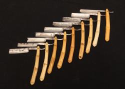 Collection of 9 bamboo pattern handled straight razors by different makers. Pattern #165, the Bamboo pattern was popular with shavers in the last quarter of the 19thC when there was a strong Asian influence in design/fashion in America. Take a close look at the handles represented here. They are not identical. In all fairness, I should have had a couple of pages in the pattern book to try and capture the variations. This "Asian-ization" of America was reflected in upholstery styles, "Japaning" of furniture, the introduction of dressing screens, ottomans, etc. It was cool to have Asian decorations and accessories, thus Bamboo. Note: I have to admit that the etched blade depicting the 1892 World's Fair in Chicago, and the etched spread eagle, slipped past me. I would have cataloged them separately. But, they are here for your acquisition and enjoyment.