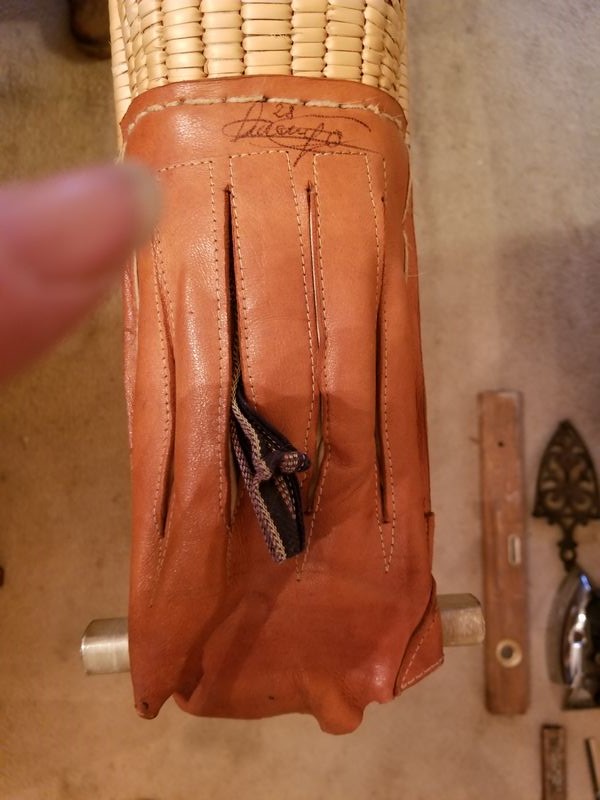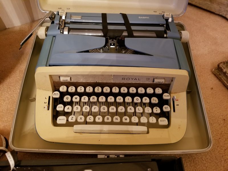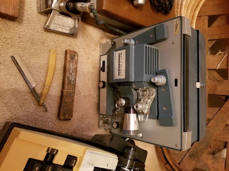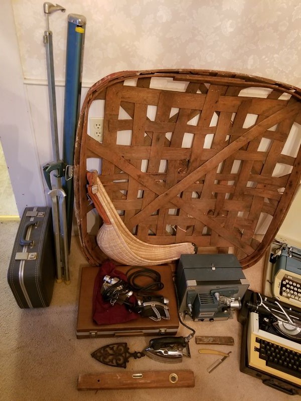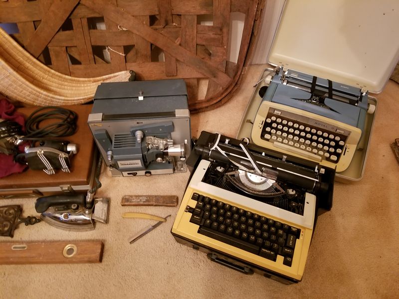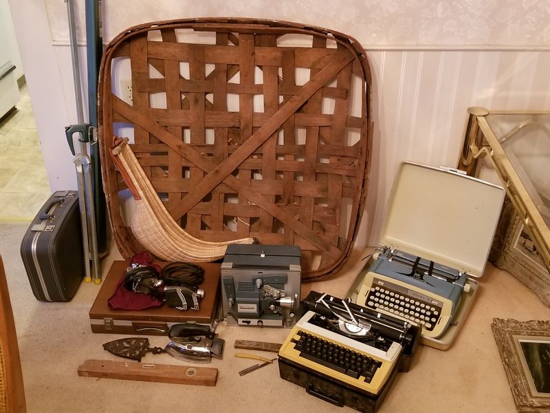 Antique and Vintage Items, Featuring Signed Jai Alai Cesta and large woven basket. Very large woven basket, 38" sq. (some breakage due to age); signed jai-alai (Hi-Li) woven device (cesta); wood level; two typewriters (one Royal); reel-to-reel projector; vintage German-made straight edge razor in case; other items seen on floor in photos.
