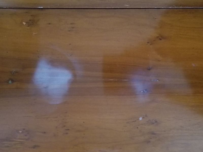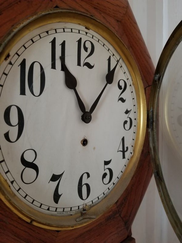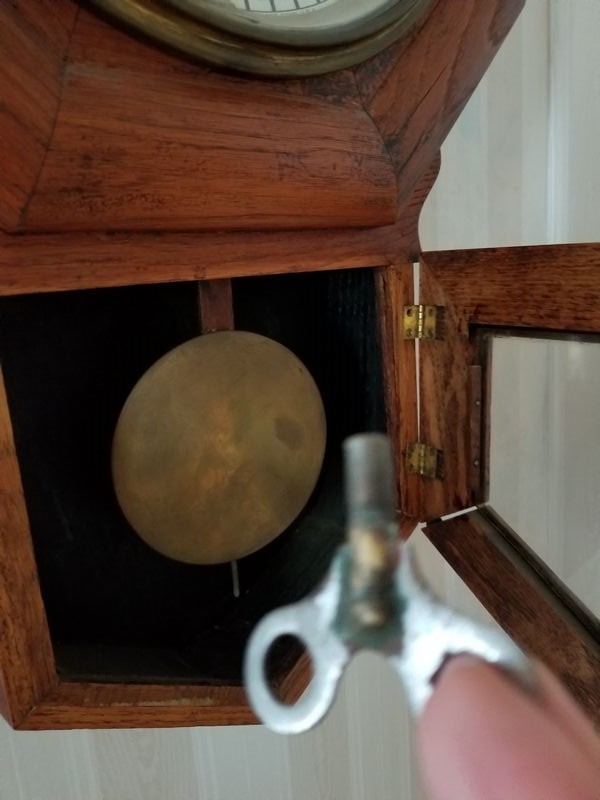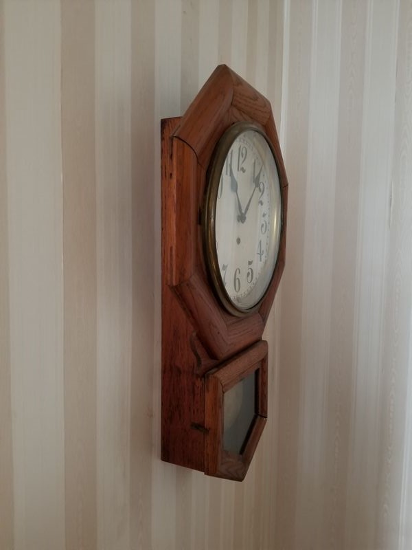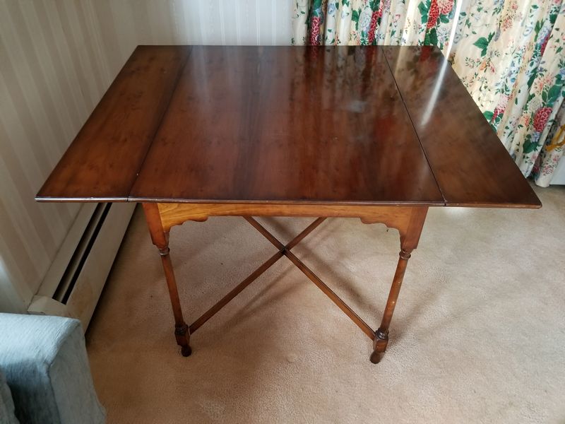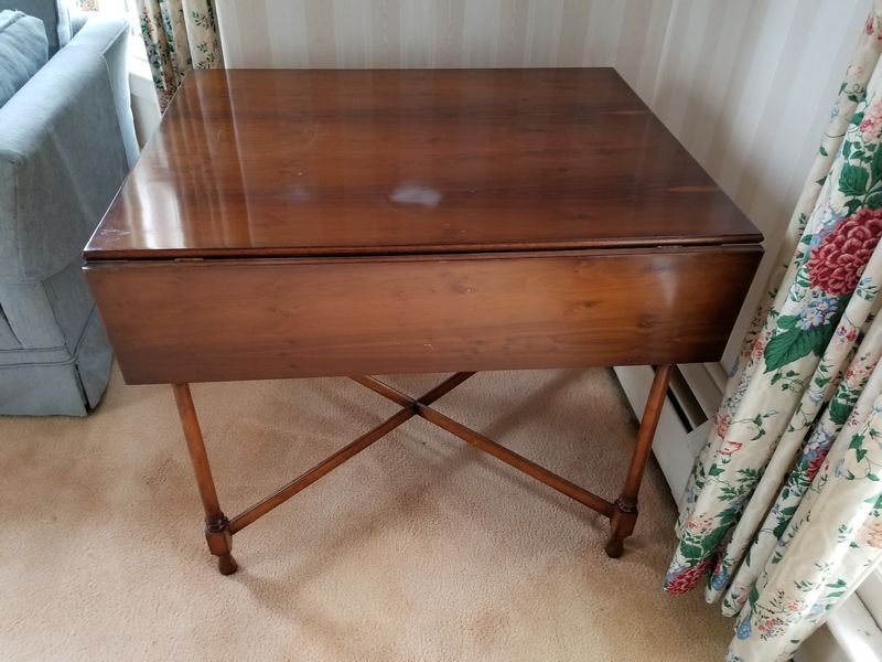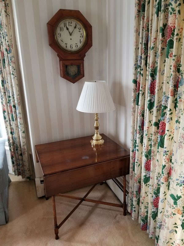 Vintage Drop-Leaf Table, Large Vintage Wall Clock, Modern Brass Lamp. Hardwood drop-leaf table, 32"Wx27"H closed, 43"Wx27"H open (two surface watermarks - see photo); octagonal brass pendulum & wood wall clock with key, 18"Wx27"H; brass table lamp with pleated shade, 27"H. Curtains seen in background not included.