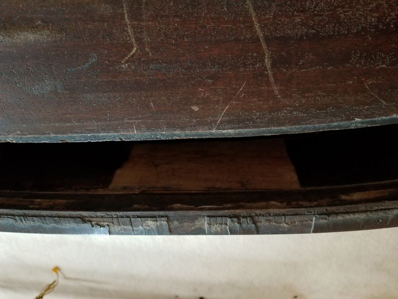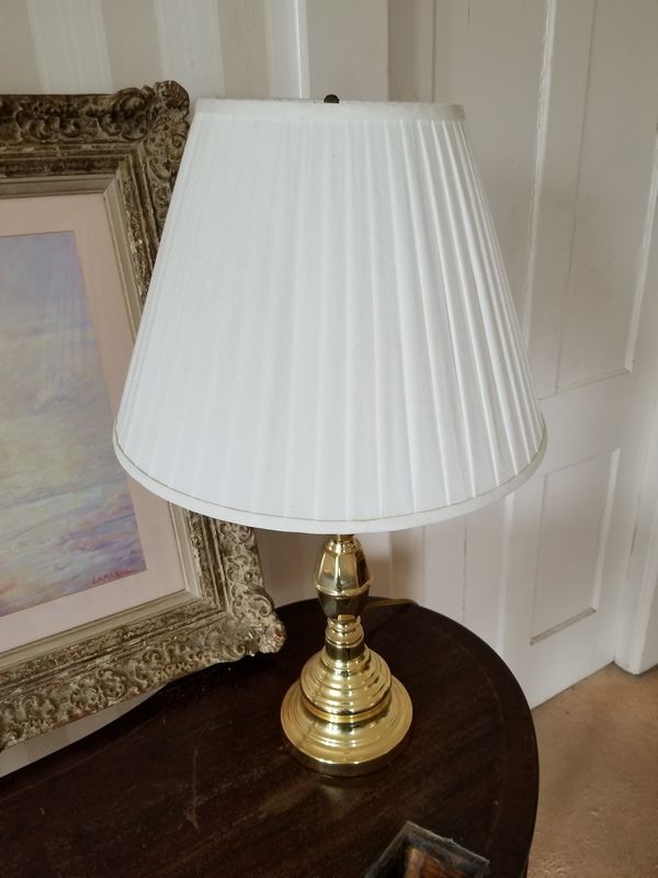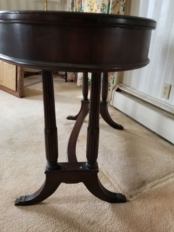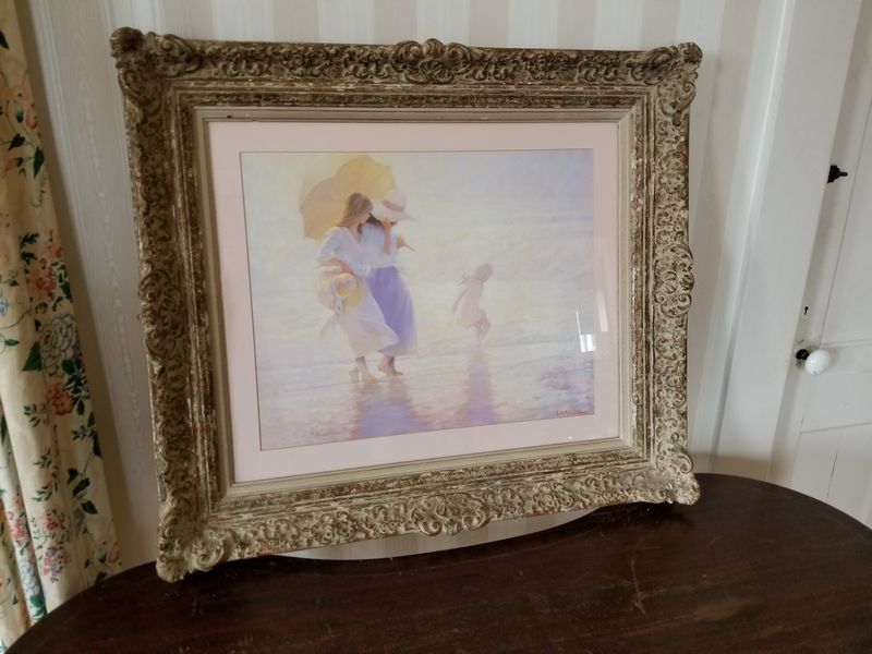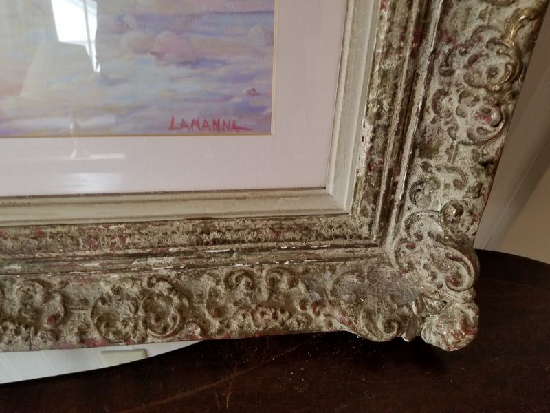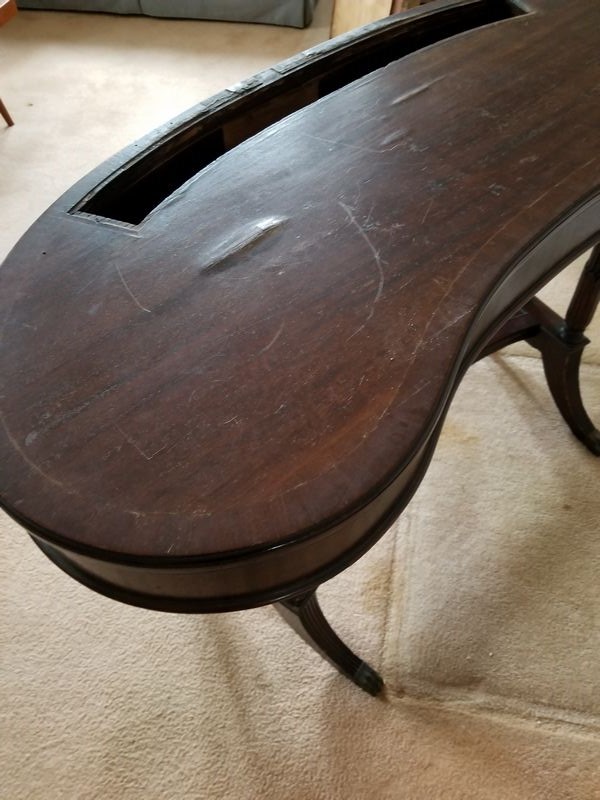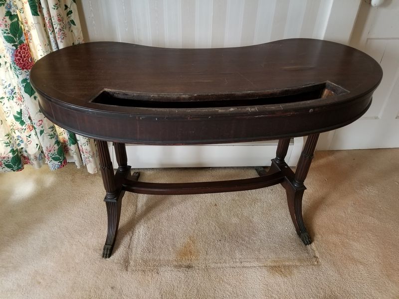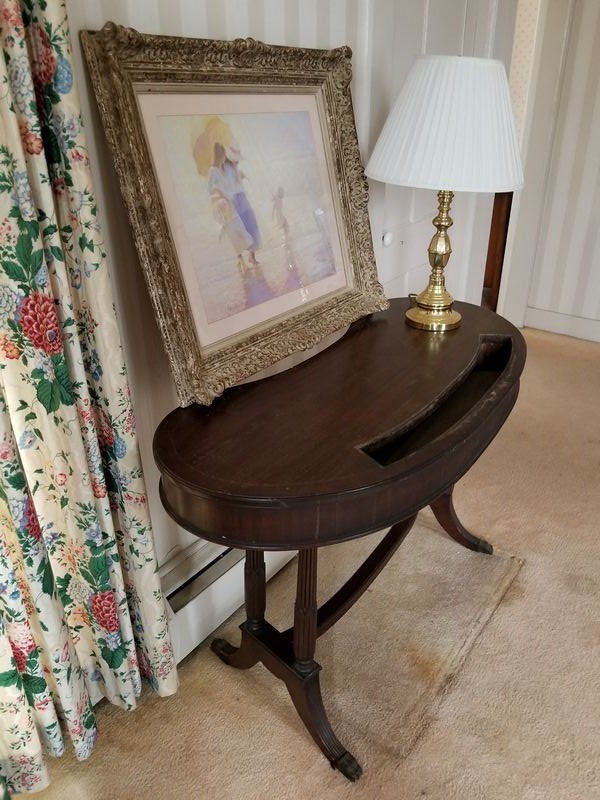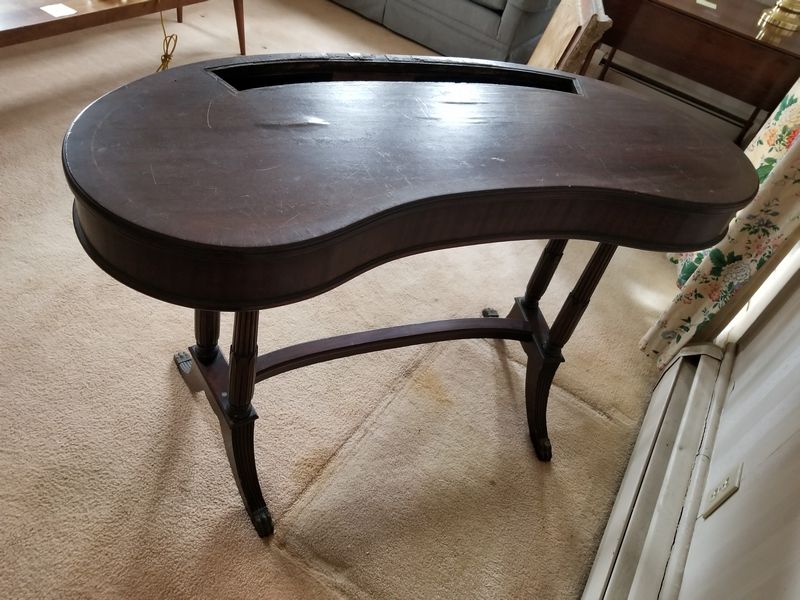 Antique Federal Style Kidney Shaped Desk with Wall Art and Brass Lamp. Kidney-shaped antique desk, 4'Wx20"Dx30"H with metal tipped feet (significant age-related surface scratches and no ink wells); large signed wall art, framed & matted, behind glass, 31"Wx27"H in a 3" thick ornate frame; brass table lamp with pleated shade, 27"H. Curtains seen in photo not included