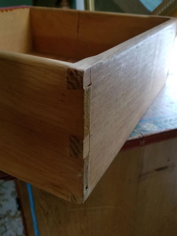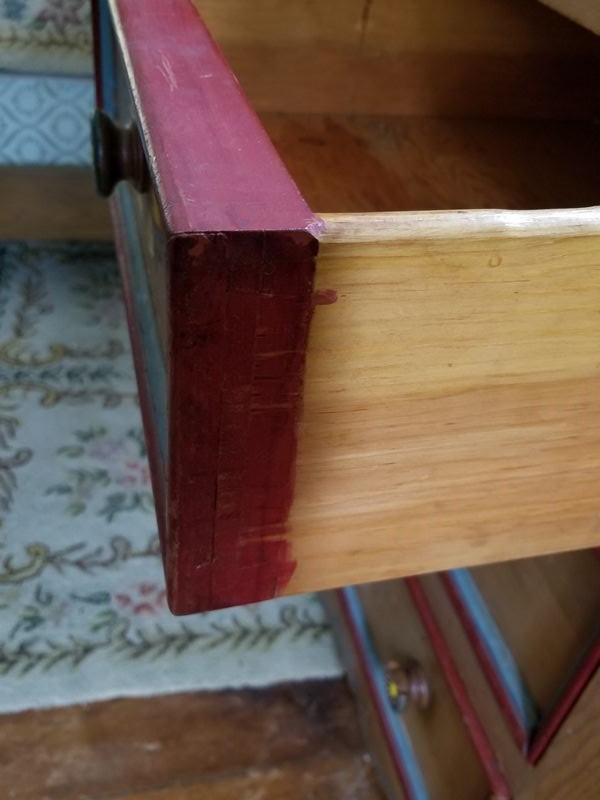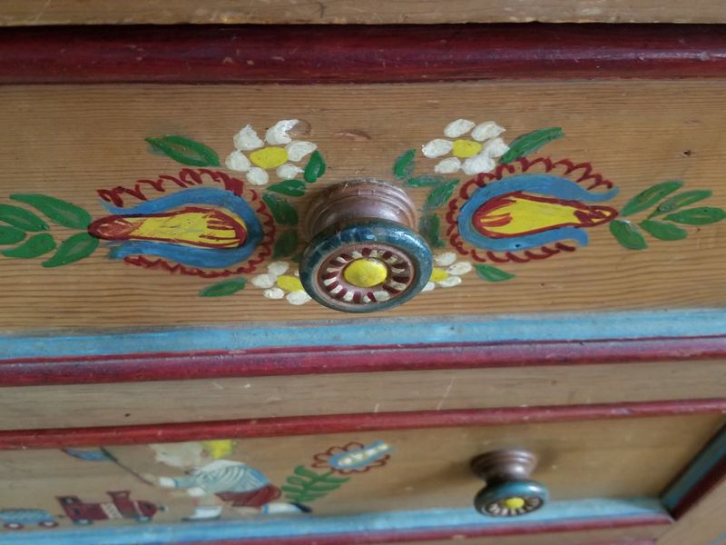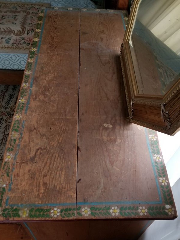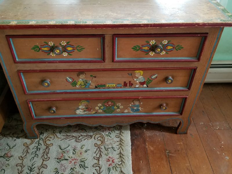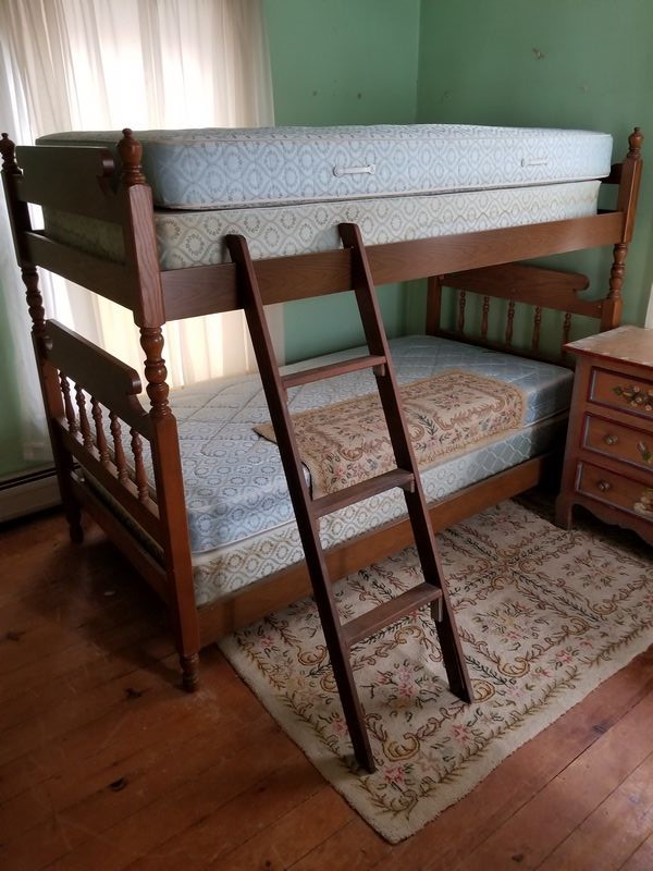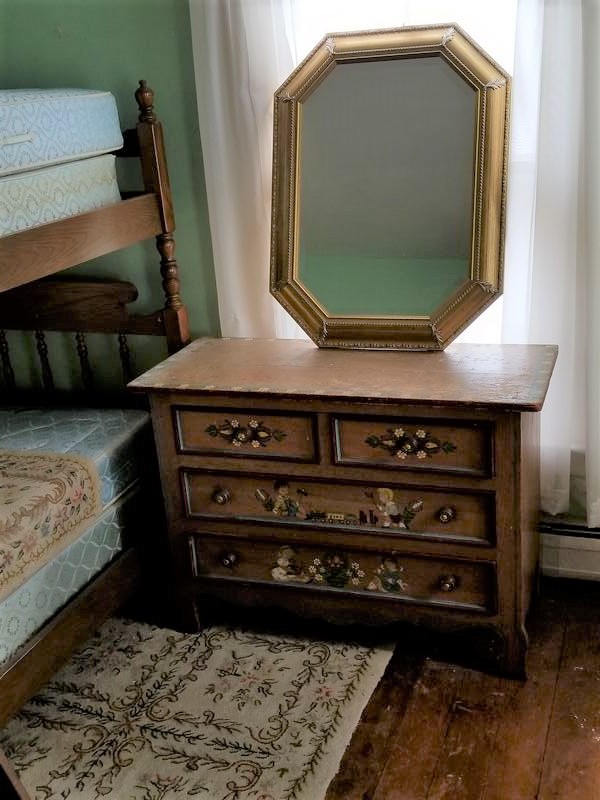 Modern Maple Bunk Beds with Antique Painted Dresser, Area Rugs, Mirror. Maple bunk bed set including bed frames, ladder, optional mattresses; antique painted four-drawer dresser with child's motif, rear dovetailing, 42"Wx18"Dx30"H (lg age-related surface crack-see photo); modern octagonal beveled wall mirror in 3" gilt frame; set of two vintage area rugs. Located on 2nd floor.