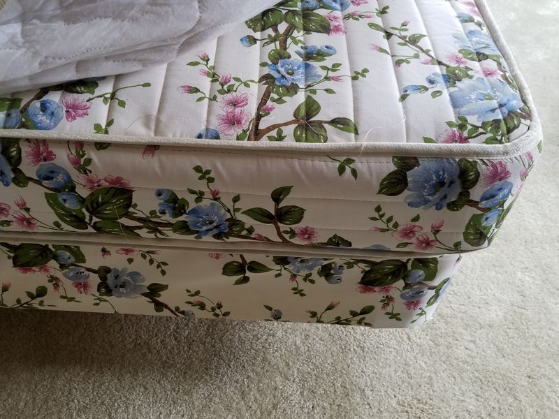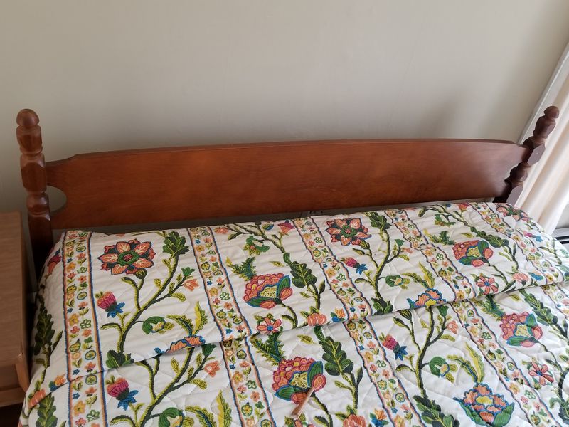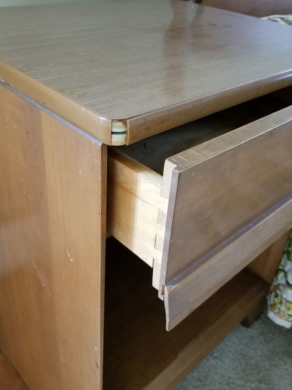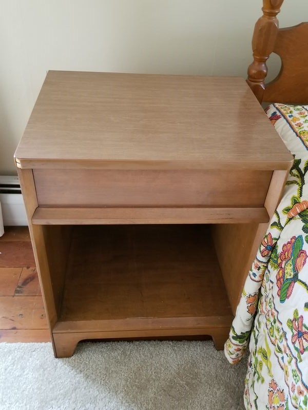 Mid Century Modern Full-Sized Bed and Single Drawer Nightstand. Mid-C modern maple HB, 54.5"Wx35"H (opt mattress set); single-drawer dovetailed nightstand with shelf (see corner damage), 19"Wx15.5"Dx26"H (matches nightstand in lot 13 and bed in lot #22). Located on 2nd floor.