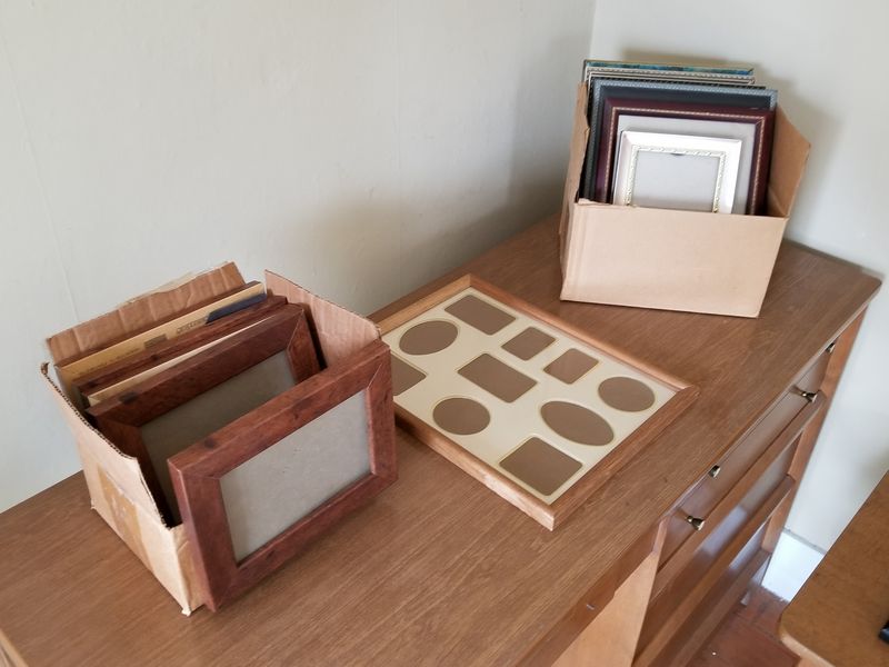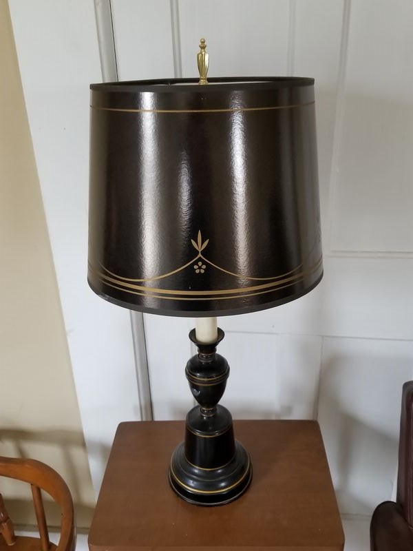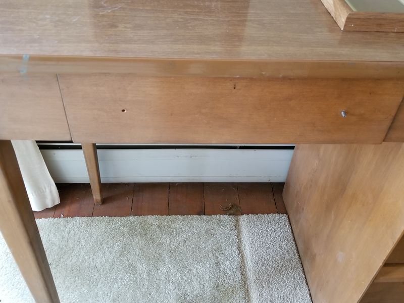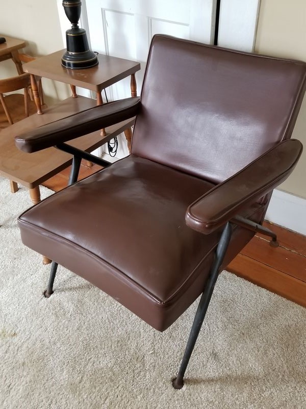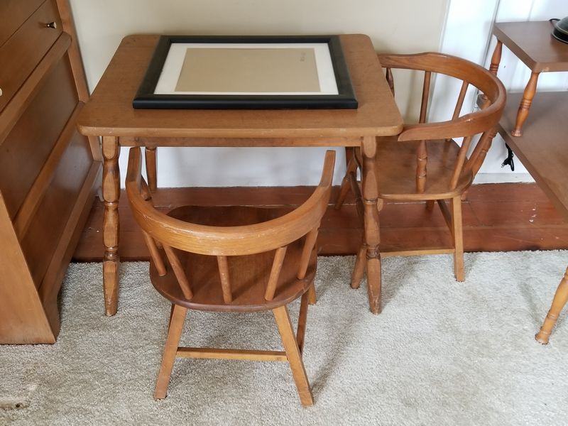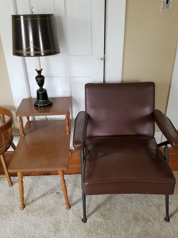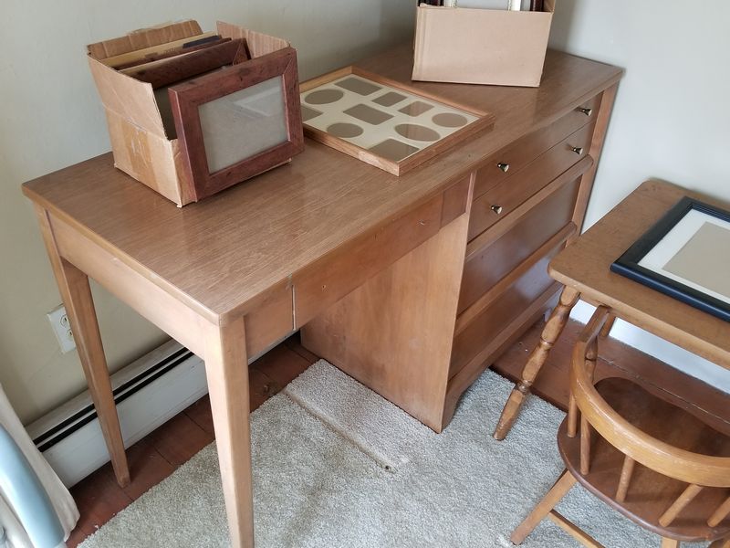 Mid Century Modern Furniture with Child's Table & Chairs. Mid-C modern student desk with four dovetailed drawers, 4'Wx19"Dx30"H (missing two drawer knobs); child's wood table, 26"Wx20"Dx21"H and set of two chairs; mid-C modern tiered end table; mid-C modern brown vinyl arm chair with blk metal legs, 25"Wx26"Dx28"H; black metal table lamp, 26"H; assorted frames seen in boxes on desk. Desk matches others in lots 13 and 21. Located on 2nd floor.