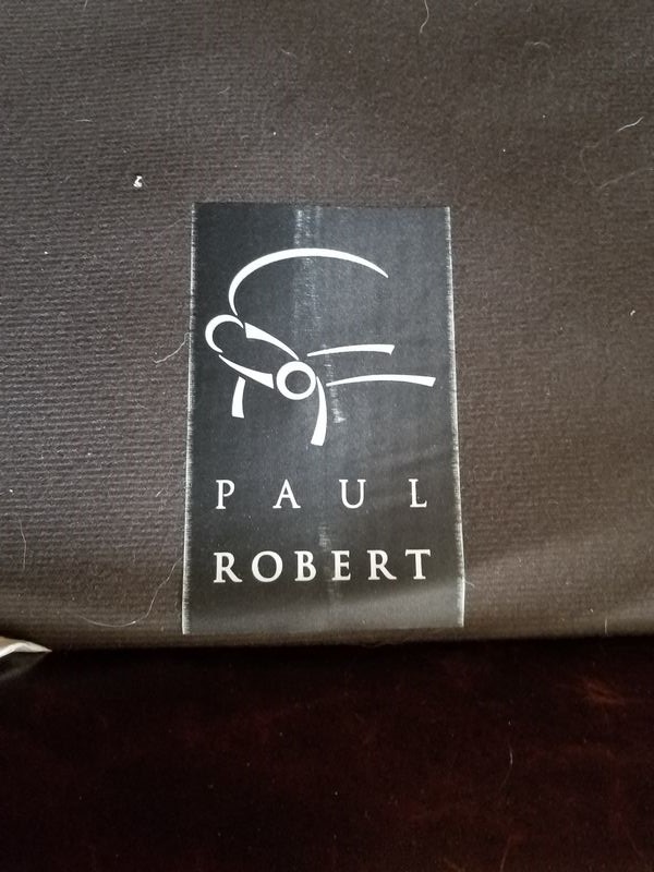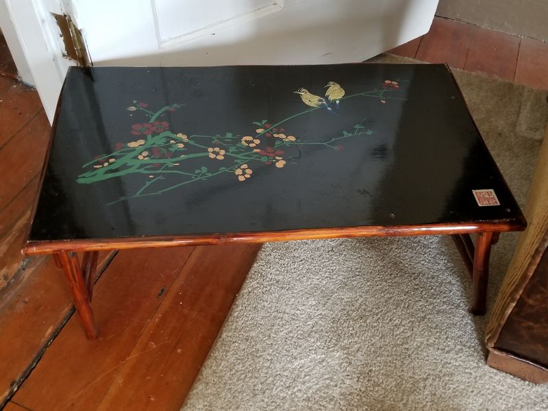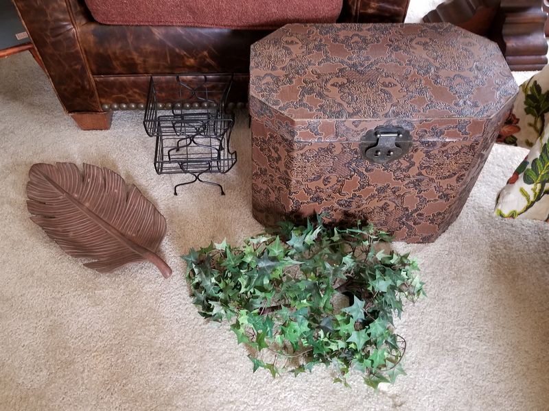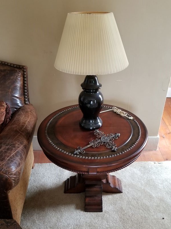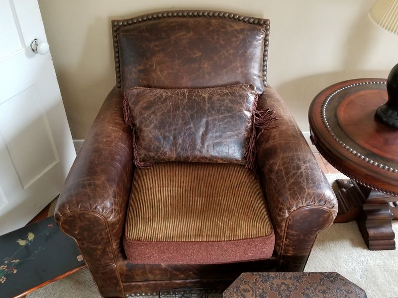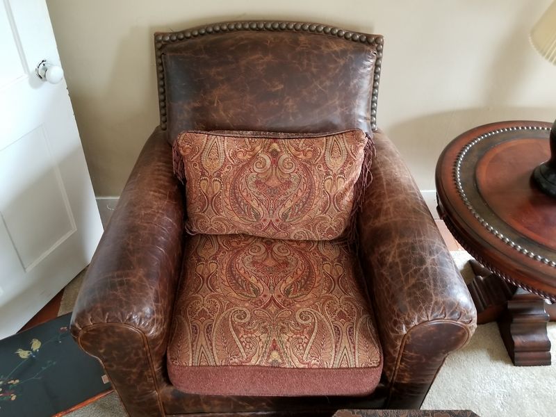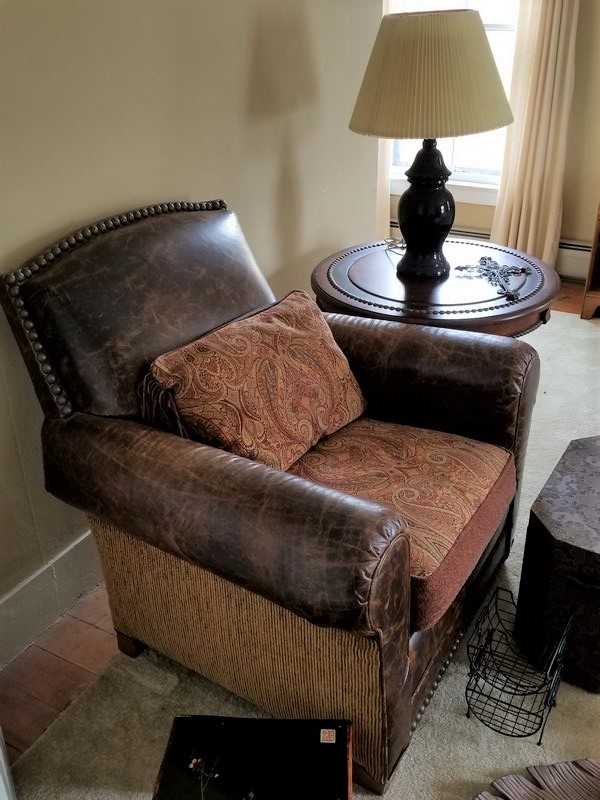 Oversized Arm Chair, Side Table and Decor. Oversized Paul Robert brown leather & upholstered arm chair (intentionally distressed) with removable & reversible seat cushion and throw pillow, brass nail head trim, 38"Wx34"Dx37"H; large round side table on pedestal base & nail head trim, 30" diameter x 2'H; folding bamboo painted oriental bed table; blue jar-style table lamp with pleated shade; decorative storage trunk; decor. Located on 2nd floor. Bring help to safely remove chair.