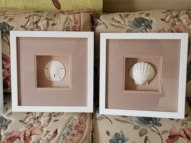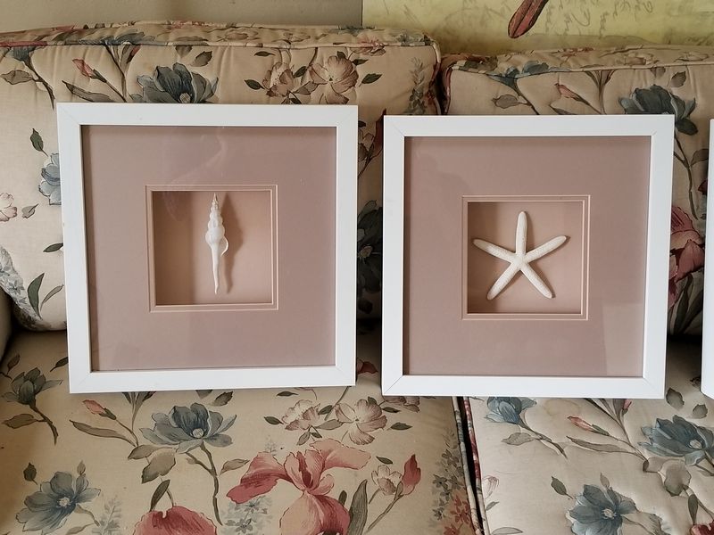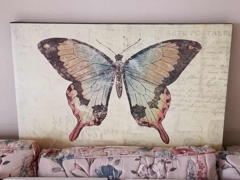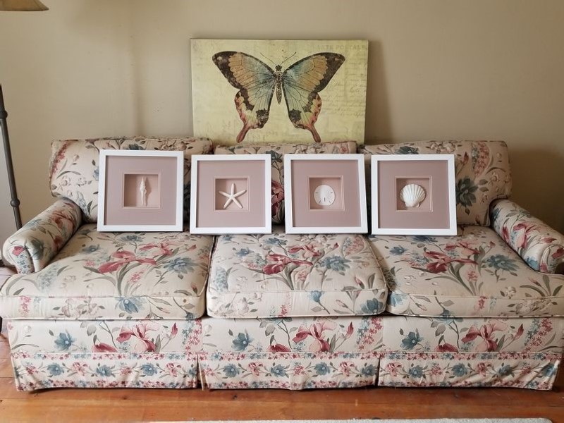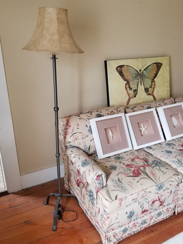 Full-Sized Sofa, Floor Lamp, Wall Art. Full-sized floral sofa 80"Lx2'Dx27"H; modern floor lamp, 62"H; large butterfly wall art; set of four shadow box beach motif wall art. Located on 2nd floor.