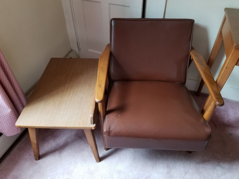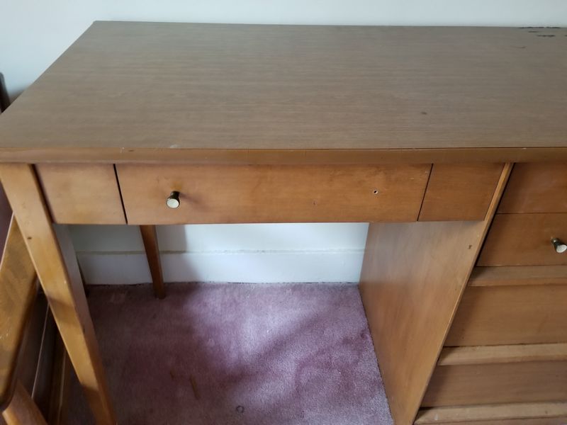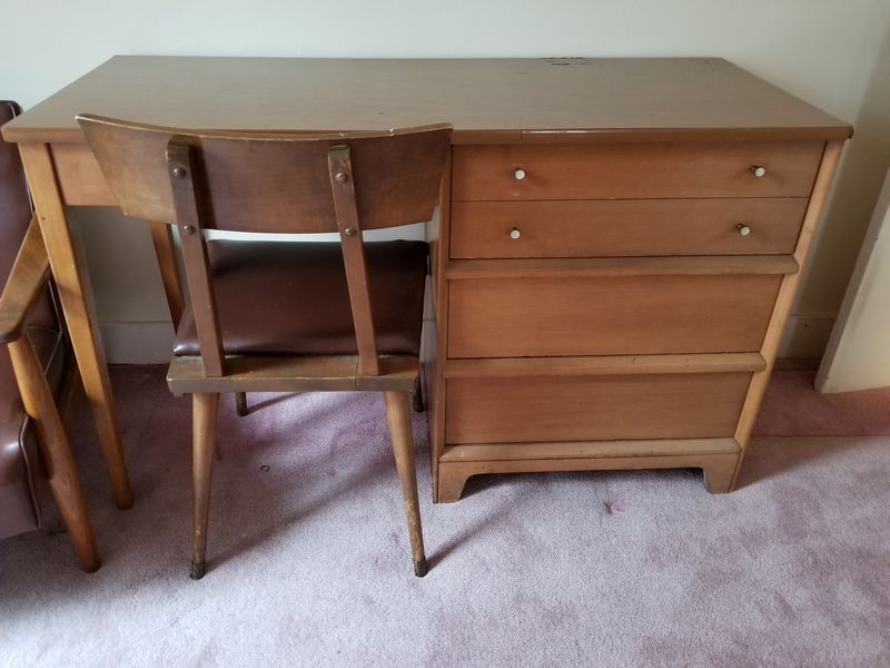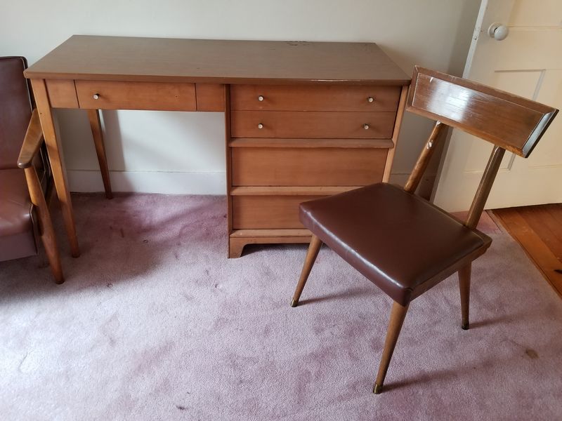 Mid Century Modern Furniture, Four Pieces. Mid-C modern student desk with four dovetailed drawers, 4'Wx19"Dx30"H (missing one drawer knob); one vinyl & wood arm chair; one vinyl & wood desk chair; end table. Desks matches others in lots 13 & 15. Located on 2nd floor.