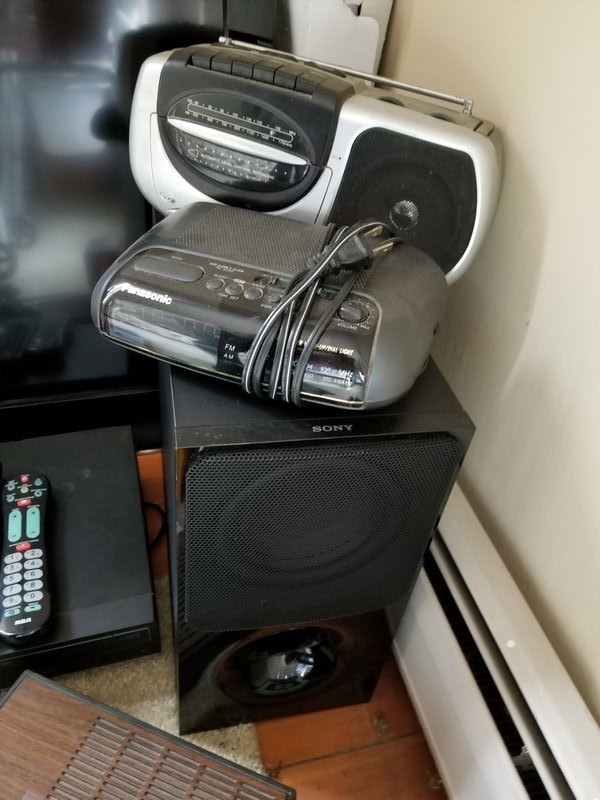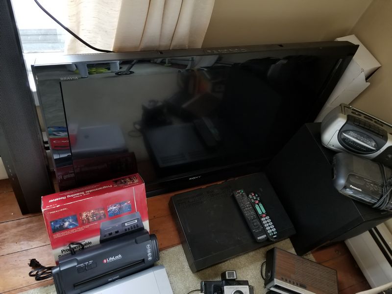 Electronics Featuring Sony Speaker System and Bravia Flat Screen TV. Flat screen TV, 38.5" diam; Sony speaker, 7.5"Wx15"Dx15"H; Sony sound board, 41"L; Polaroid camera; spreader; radios and other items seen in photos. Located on 2nd floor.